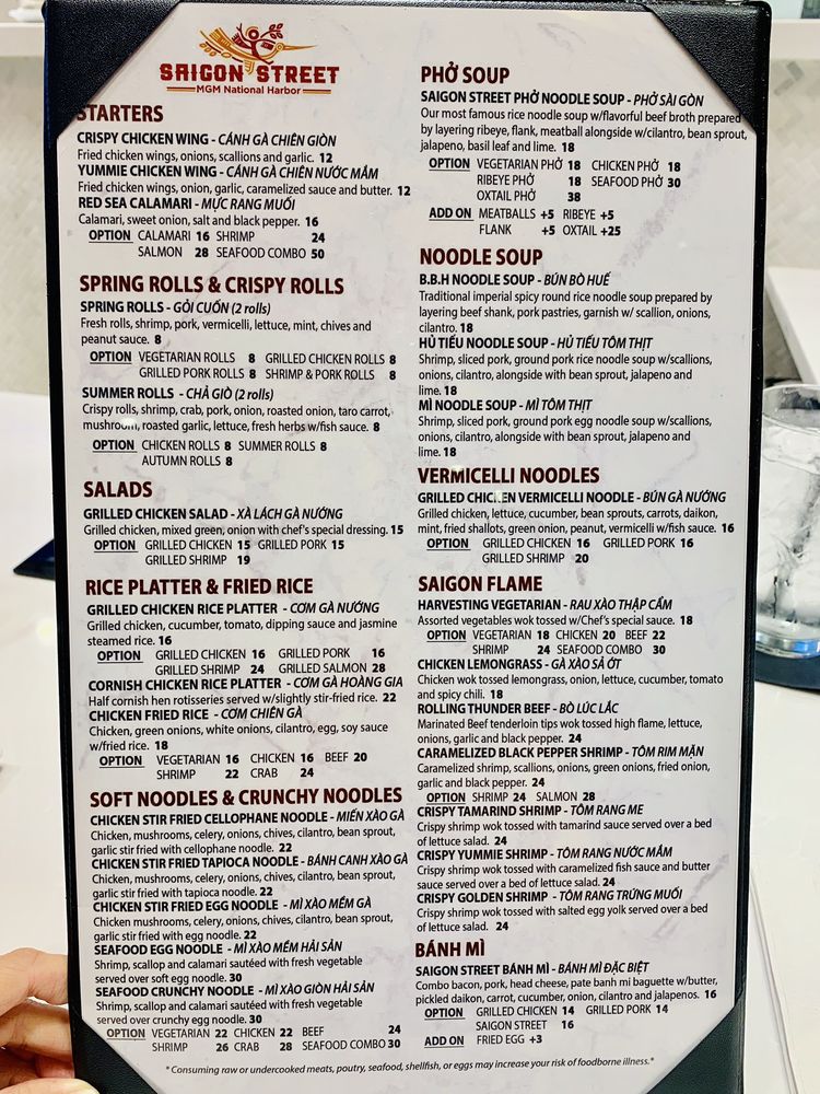 Welcome to Saigon Street, a hidden gem nestled in the MGM National Harbor, Oxon Hill. Specializing in authentic Vietnamese cuisine, Saigon Street offers a delightful array of dishes perfect for all palates, including vegan and vegetarian options. You can indulge in crispy Yummie Chicken Wings or warm up with their exotic Asparagus Crab Soup.